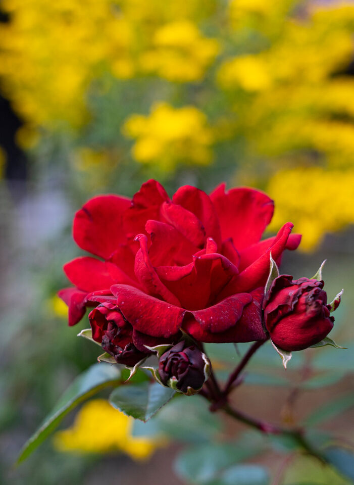 Trädgårdens röda rosor blommar fortfarande. I bakgrunden skymtar gullris som jag uppskattar även om den är näst intill invasiv :)