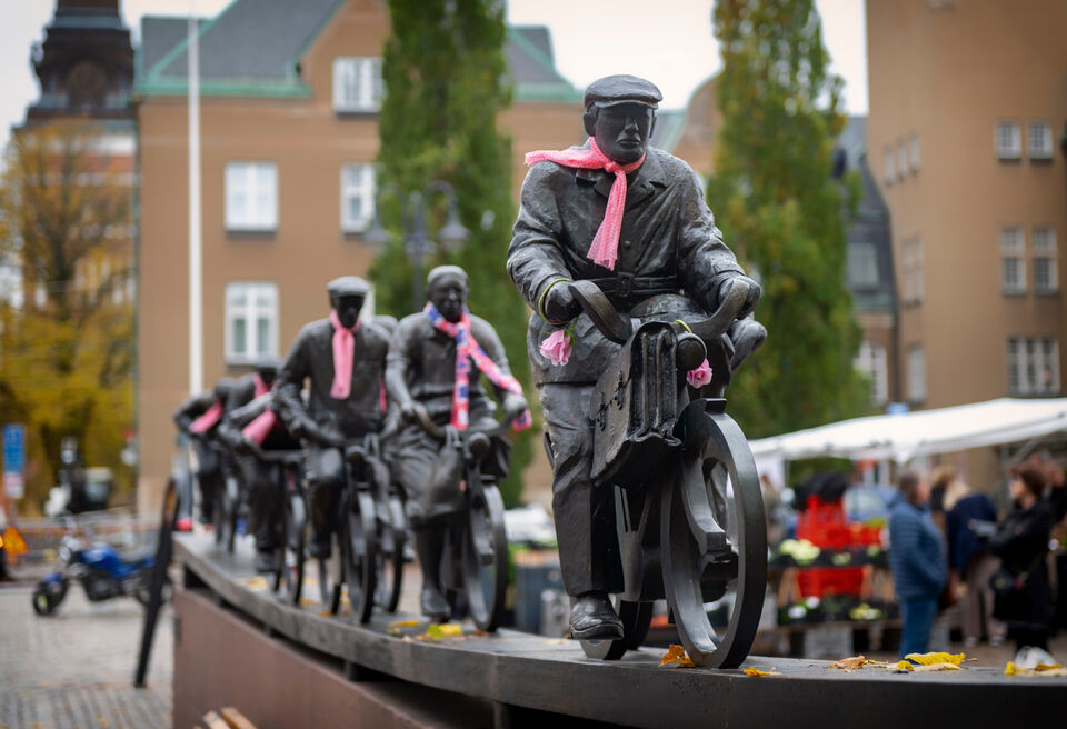 Sista lördagen i oktober och riktig höststämning på Stora torget i Västerås. Den populära statyn ASEA-strömmens cyklister är pimpade med blommor och för årstiden lämpliga halsdukar.