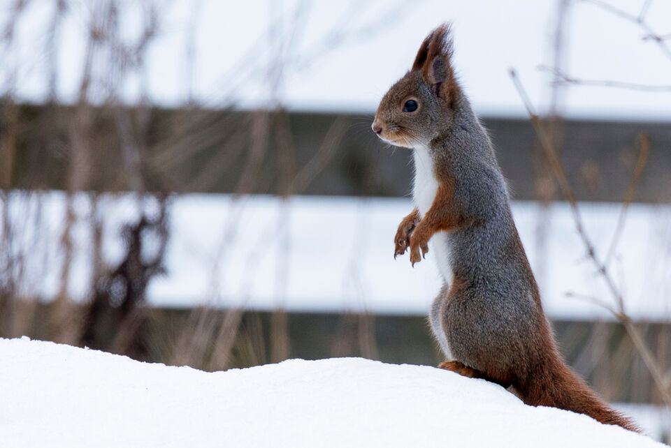 nr 1 - ekorren är på sin vakt när den närmar sig fågelmatningen i vår trädgård
