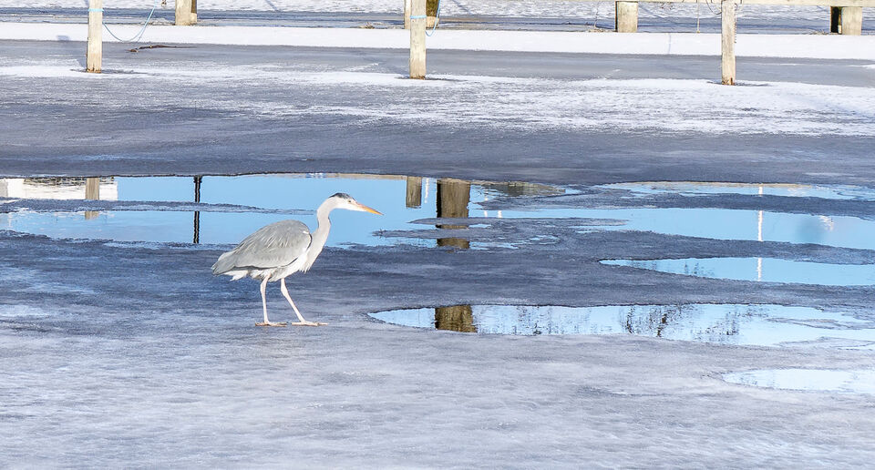 nr 1 - På isen smyger en häger fram mot en vak för att försöka fånga något att äta