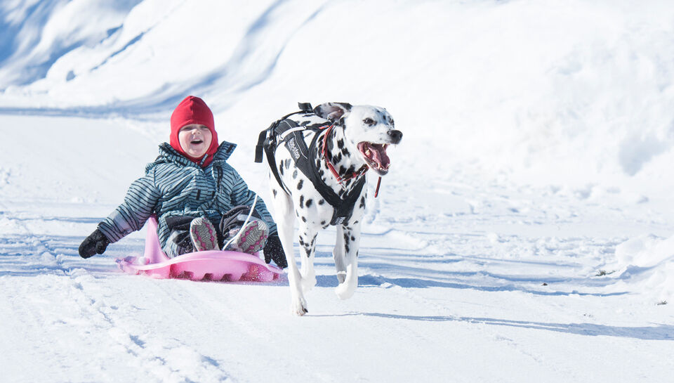 Dalmatinern Stella passar bra att fotografera i snö och här i Sälen är det mycket av den varan. Här står hon i den skottade gången fram till stugan.