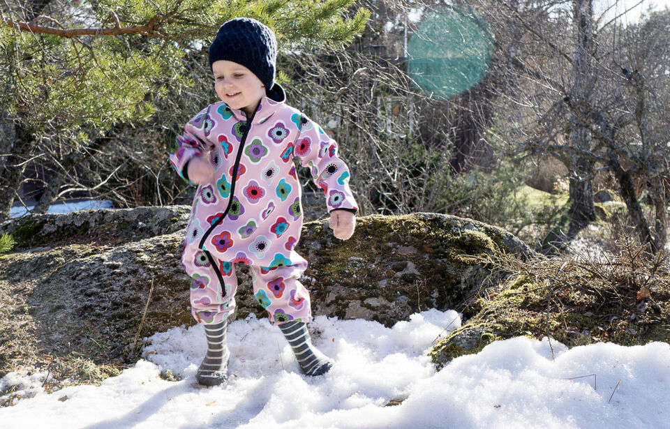 Barnbarnet Julienne dansar bort de sista snöresterna på altanen
