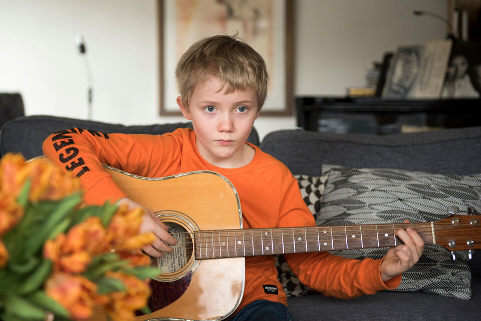 nr 1 - Barnbarnet Otto tränar på att spela gitarr