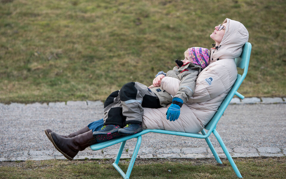 nr 1 - Beppe och mamma Linéa provar en solstol inför kommande badsäsong på Lögarängen
