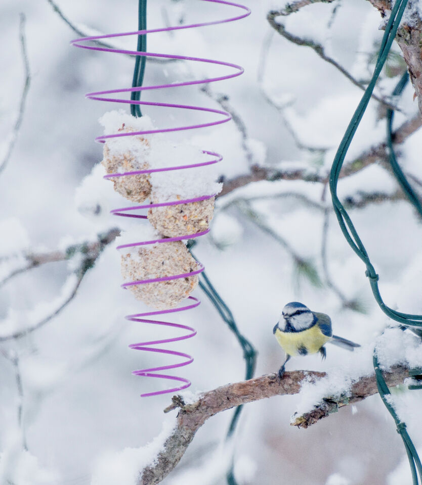 Idag föll det rejält med snö och blåmesarna tycktes uppskatta fågelmaten i trädgården
