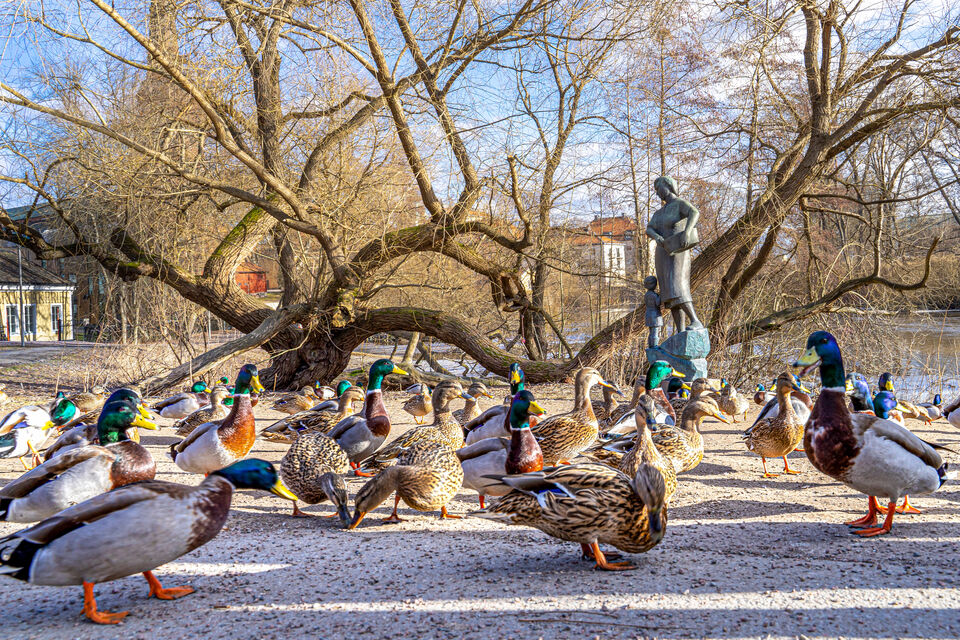 Änderna samlas runt statyn "Tvätterskan" av Yngve Andersson som står vid Djäknebron