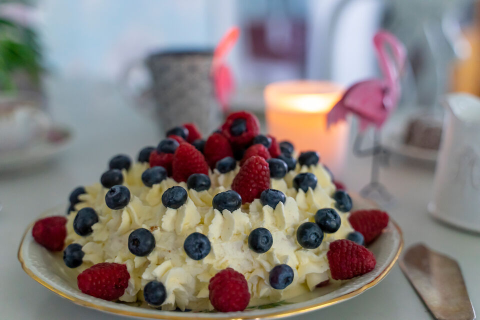Barnbarnet Julienne bjöd in till kaffekalas med hembakad tårta för att fira att hon börjat i förskoleklass