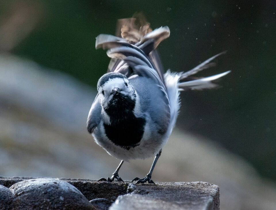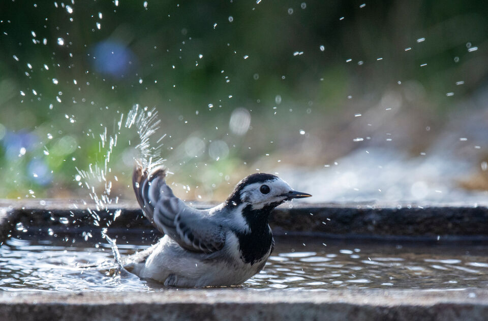 Trädgårdens fågelbad är populärt. Sädesärlan skvätter och beter sig som en riktig badanka.