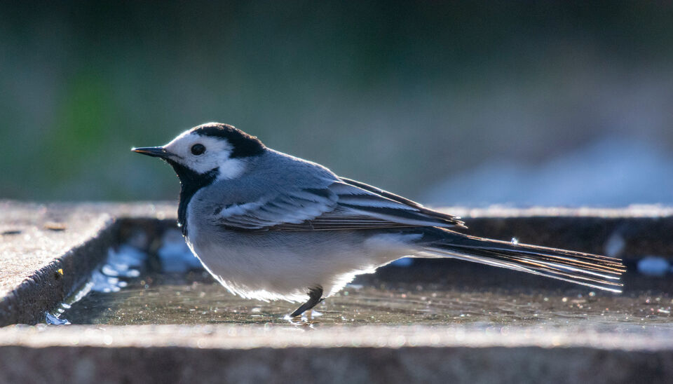 Fler bilder på sädesärlan som dagligen, i kvällningens motljus, besöker vårt fågelbad