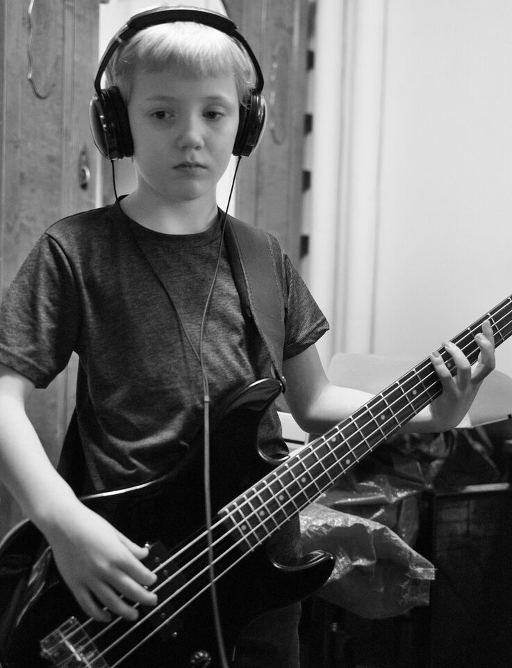 Barnbarnet Otto lär sig använda musikprogrammet "GarageBand" som är ett roligt verktyg för musikskapande. Här koncentrerar han sig på att spela in basen i sitt projekt.
