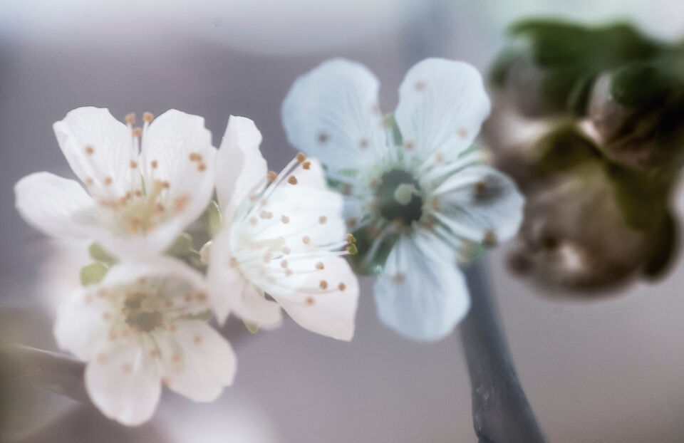 I dag slog körsbärsknopparna ut och ute fortsätter det att snöa och jag fortsätter experimentera med dubbelexponeringar. (bild 68/365)