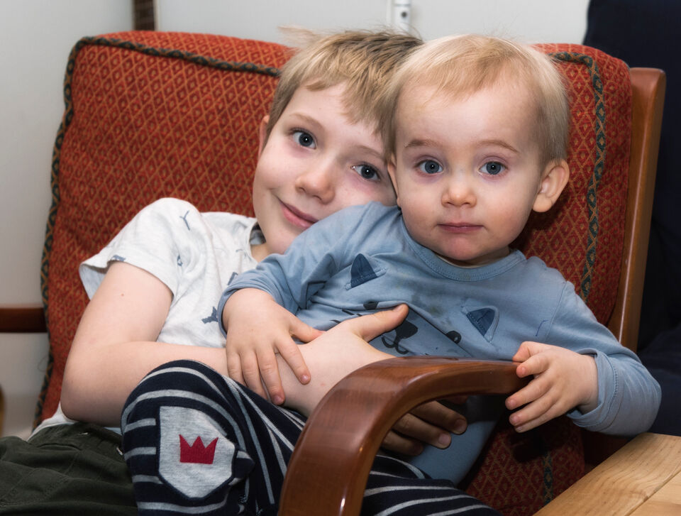 Barnbarnen Otto och Rufus myser lite innan frukost